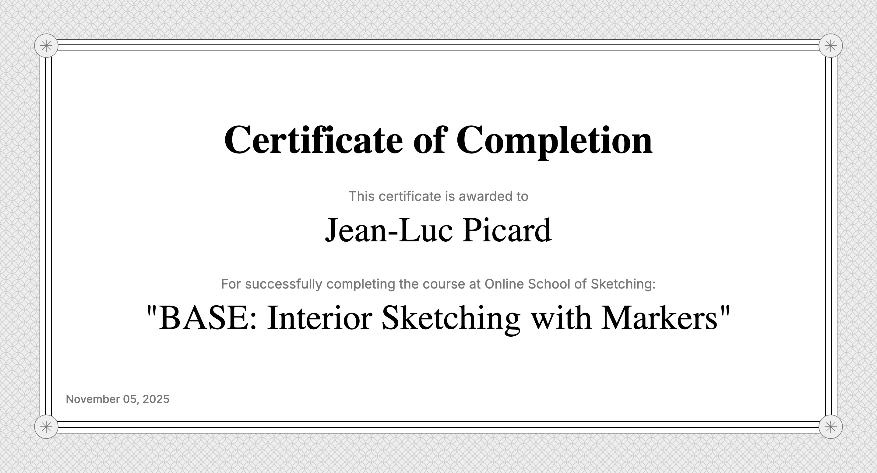 Upon finishing the course, you’ll receive a personalized Certificate of Completion, a recognition of your new skills in interior sketching. Many of my students proudly add it to their design portfolios, LinkedIn profiles, and university applications as proof of professional development.