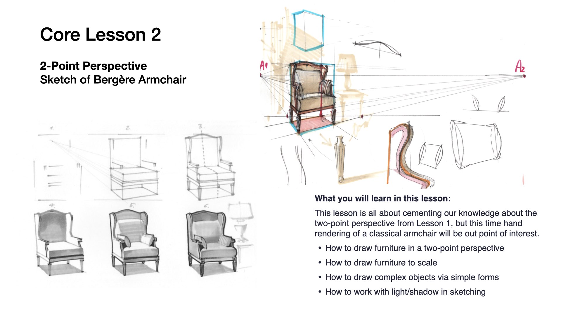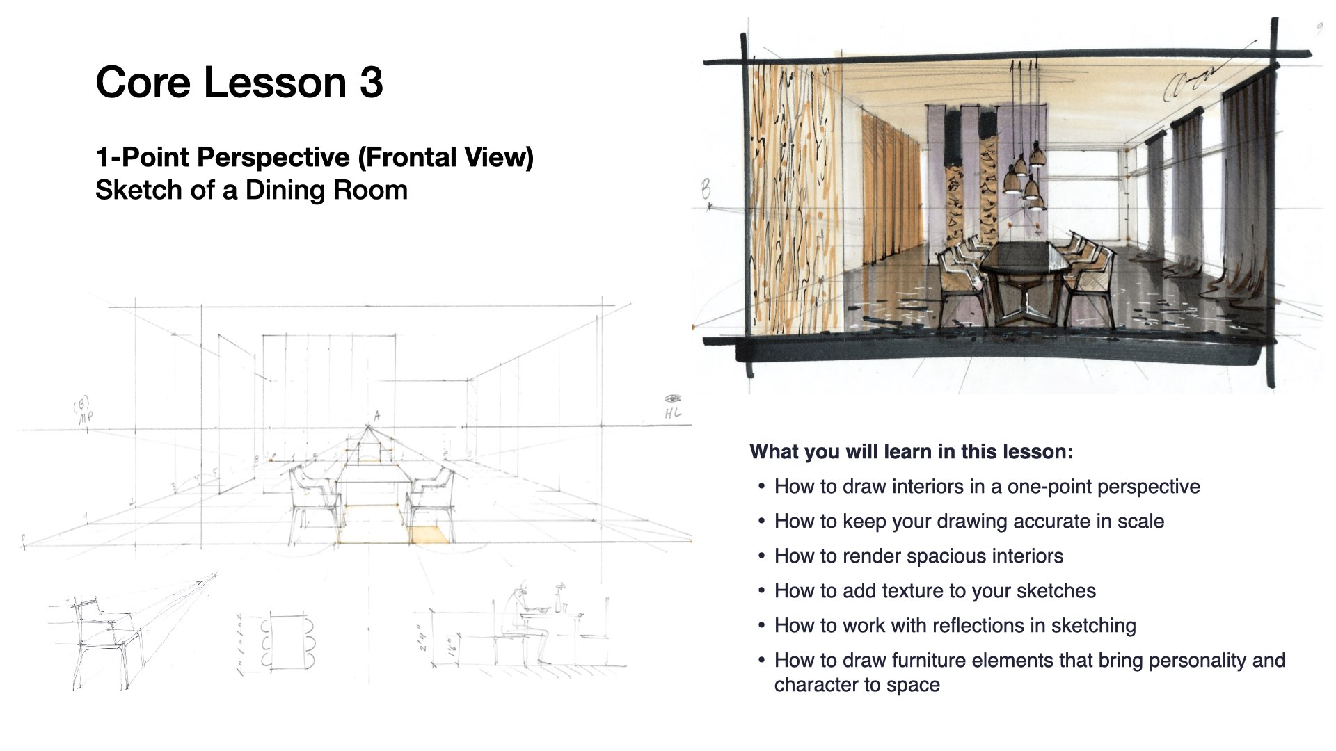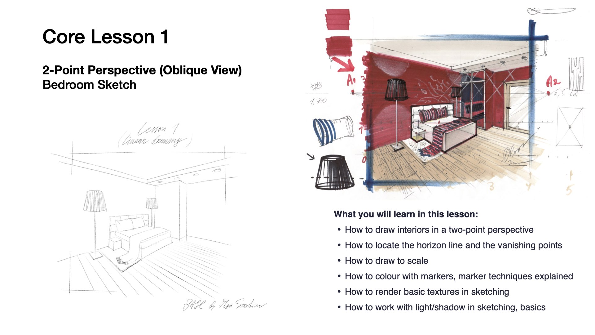 Through this comprehensive step-by-step program, complete with follow-along video tutorials, you will build a strong foundation in Interior Sketching with Markers and Perspective Drawing for Interior Design — all in just five weeks of self-paced learning (if you accomplish one core lesson per week).