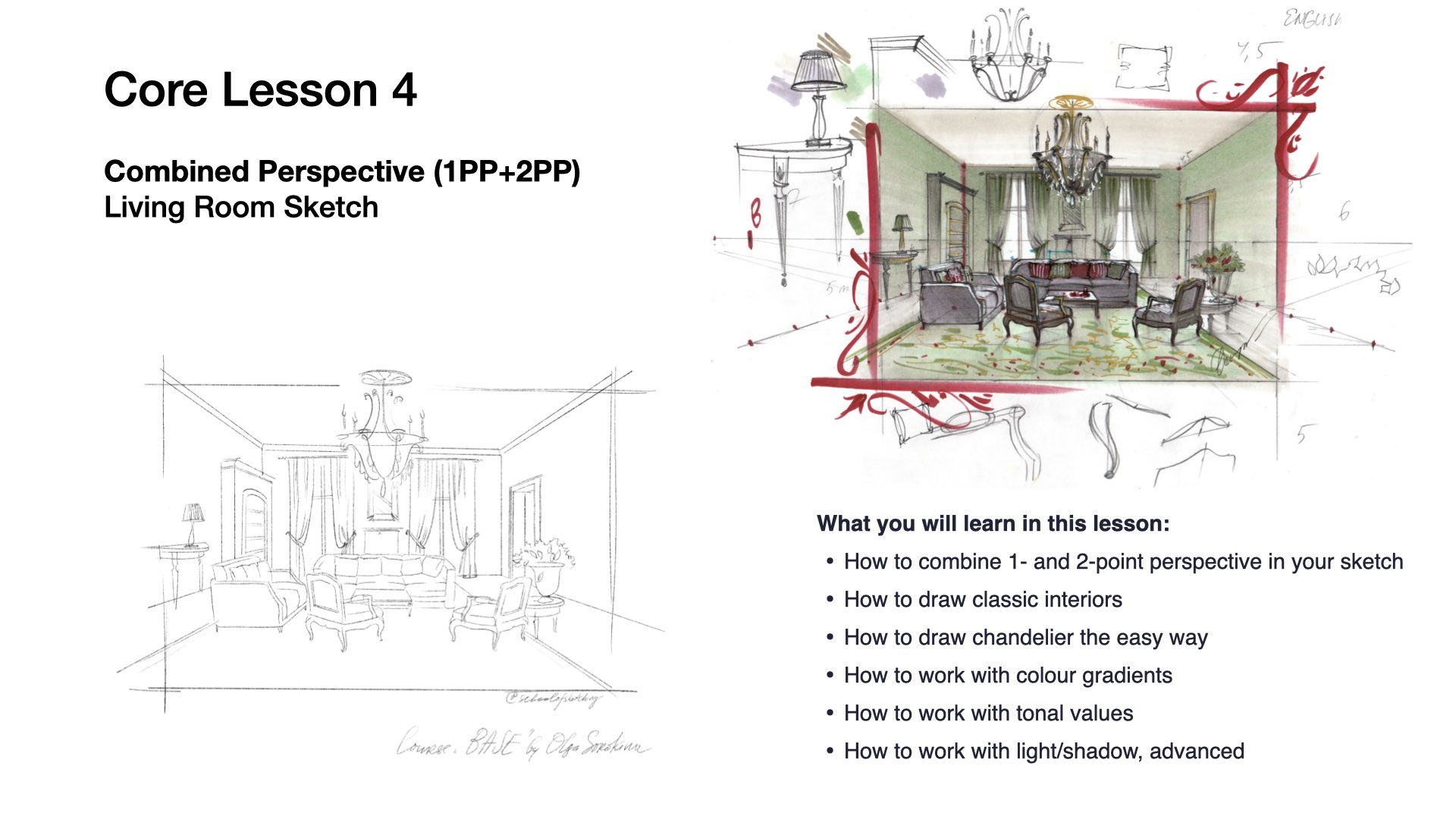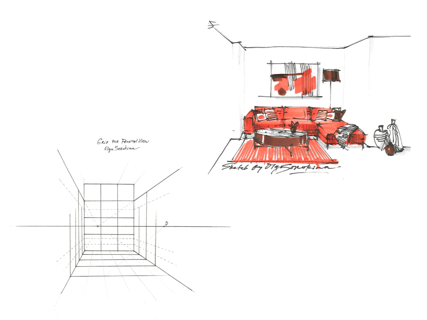 Olga Sorokina is an award-winning interior designer, sketch artist, author of the internationally acclaimed book "THE SKETCH. Interior Design Drawing", fouder of Online School of Sketching Ltd, and an experienced educator who has been teaching interior sketching for over a decade.