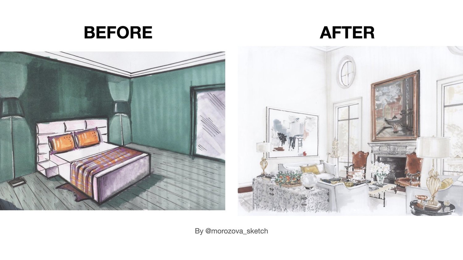 Over the years of teaching, I’ve met hundreds of interior designers who told me that once they learned to draw, to express their ideas freely on paper, something inside them changed. Many described feeling like real designers for the first time. Before, they relied only on software and felt something missing, a kind of professional gap, an inner hesitation. But after learning sketching, they spoke differently with their clients, with more confidence and pride. They said they finally felt like artists, the kind of professionals their clients expected them to be.